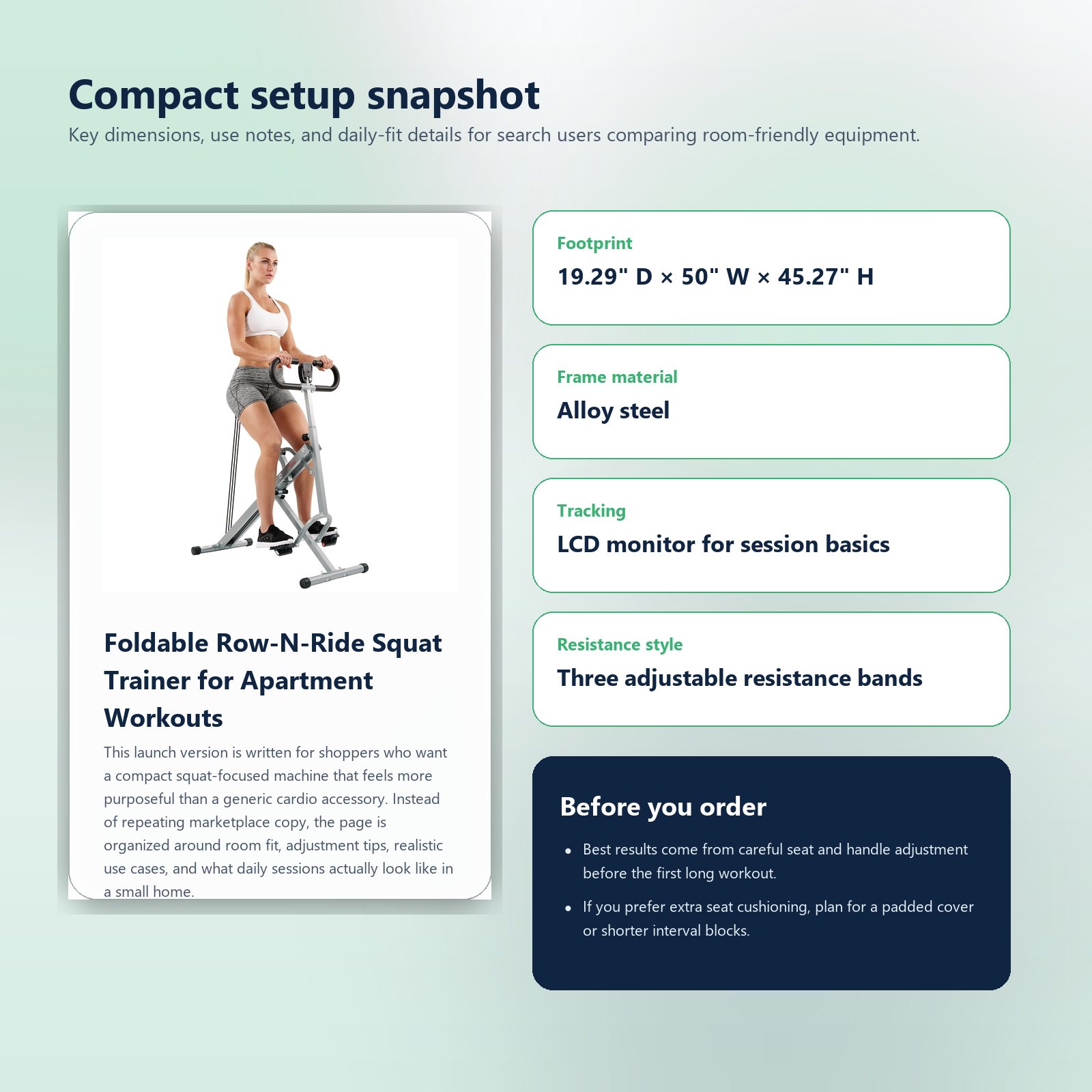 This launch version is written for shoppers who want a compact squat-focused machine that feels more purposeful than a generic cardio accessory. Instead of repeating marketplace copy, the page is organized around room fit, adjustment tips, realistic use cases, and what daily sessions actually look like in a small home.