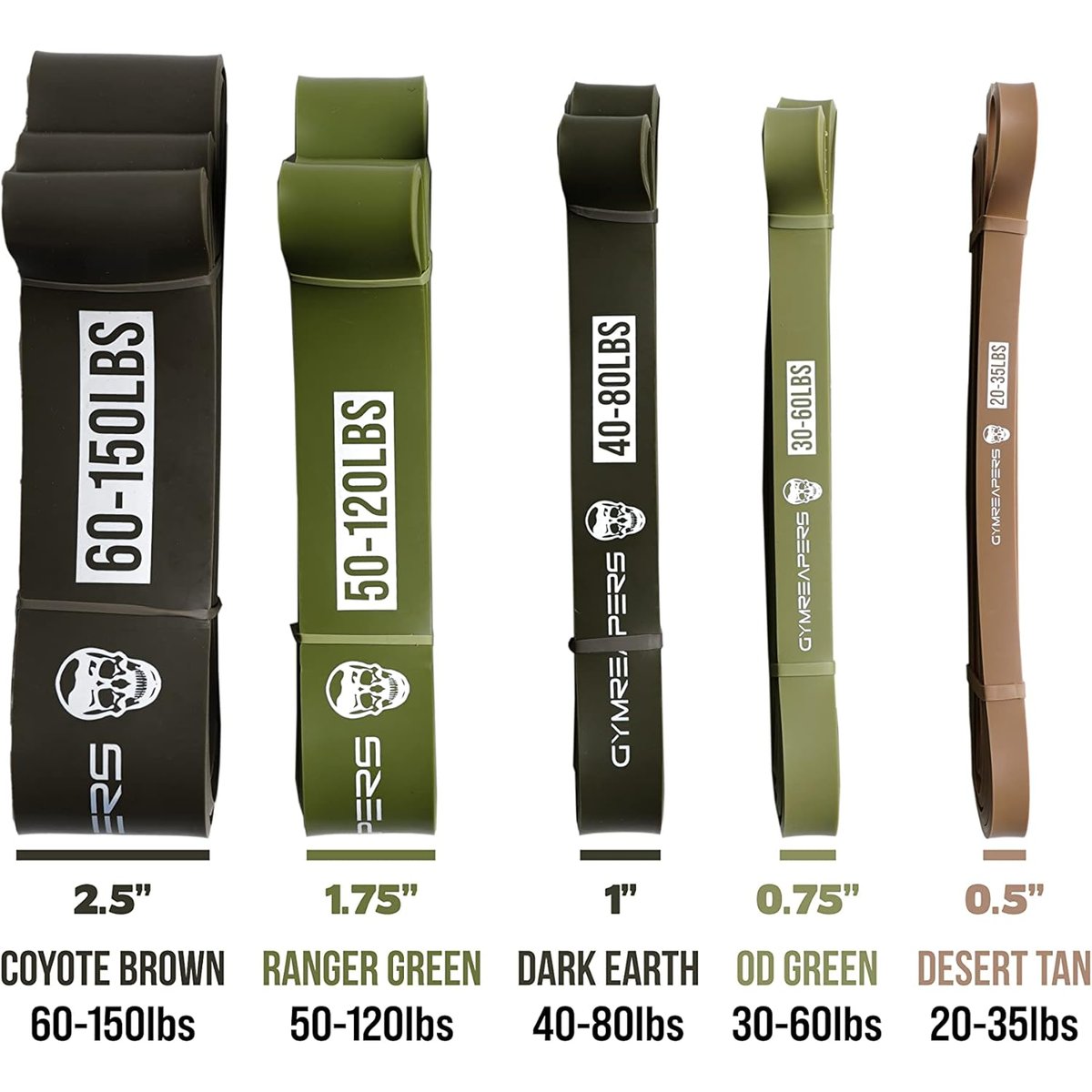 - 5 COLOR CODED OPTIONS ACCORDING TO WEIGHT – Get shredded and improve your overall endurance without sacrificing quality. The Gymreapers Pull Up Bands come in several key colorways so you easily pick out the correct weight according to its color. Work out indoors or outdoors in style with bands that come in Desert Tan (20-35lbs), Ranger Green (30-60lbs), Dark Earth (40-80lbs), OD Green (50-120lbs), and Coyote Brown (60-150lbs).