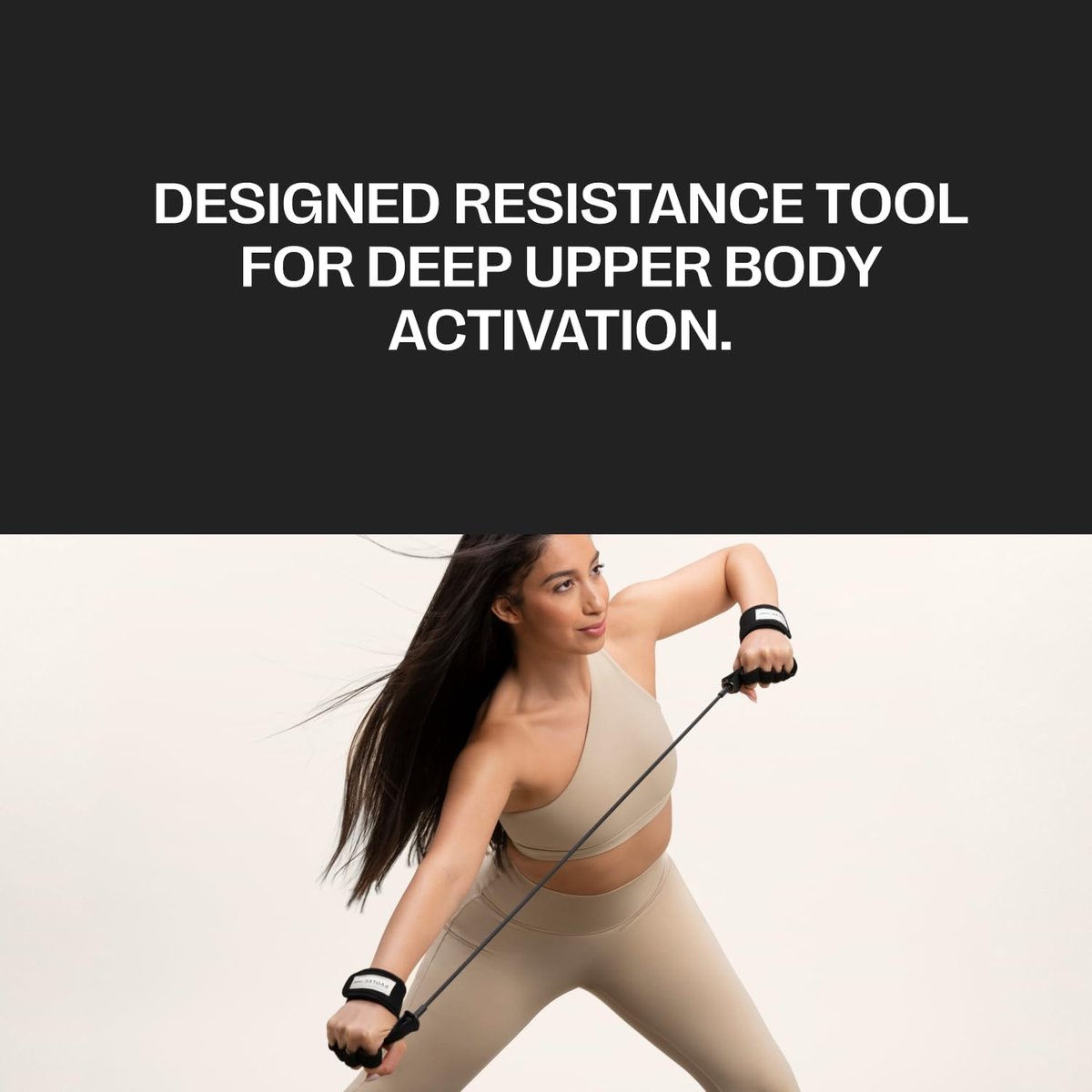 • Our patented resistance tool is used for deep upper body activation to work your arms, back and shoulders like never before. Glove-like design allows the work to stay in your arms—not in your grip.