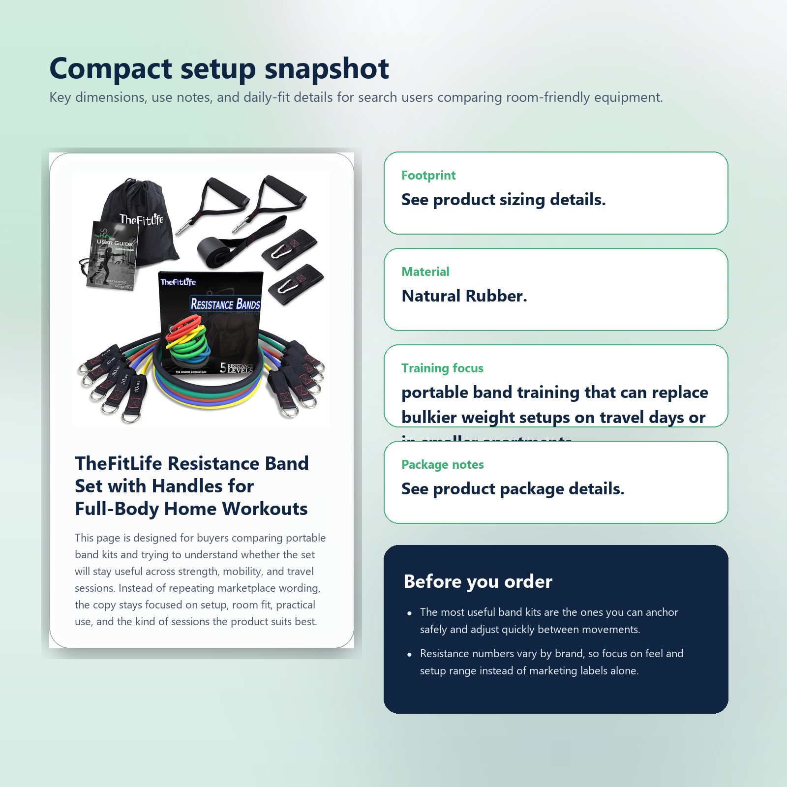 This page is designed for buyers comparing portable band kits and trying to understand whether the set will stay useful across strength, mobility, and travel sessions. Instead of repeating marketplace wording, the copy stays focused on setup, room fit, practical use, and the kind of sessions the product suits best.