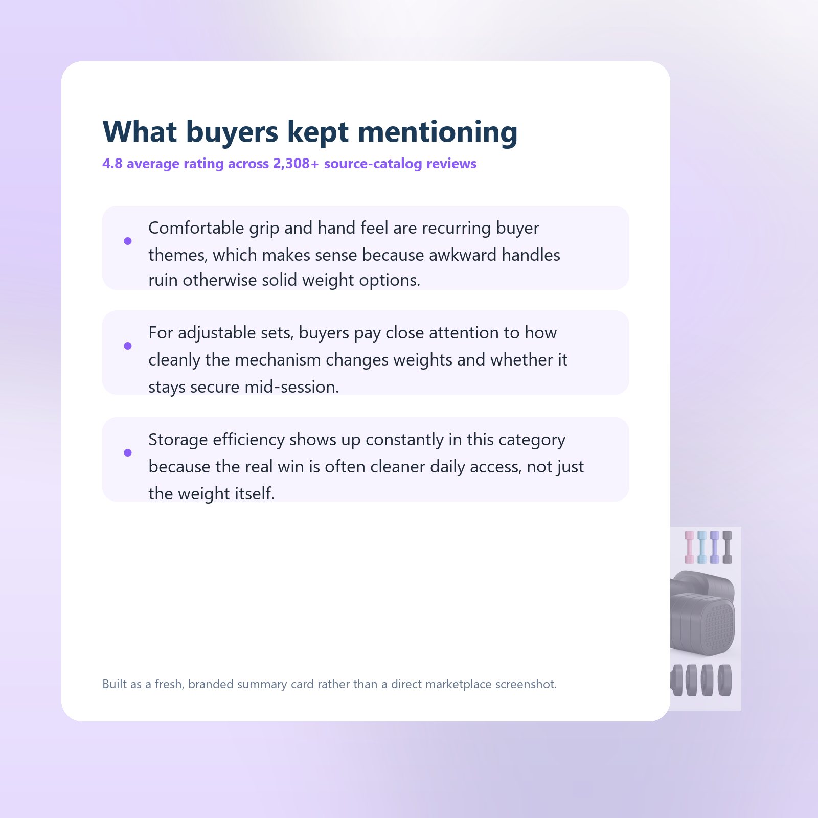 - Comfortable grip and hand feel are recurring buyer themes, which makes sense because awkward handles ruin otherwise solid weight options.